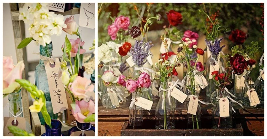 Flašice ukrašene cvećem ili nekim drugim detaljem, mogu biti sjajan način da gostima dodelite kartice sa imenima. Poklon i kartica u jednom! 🙂